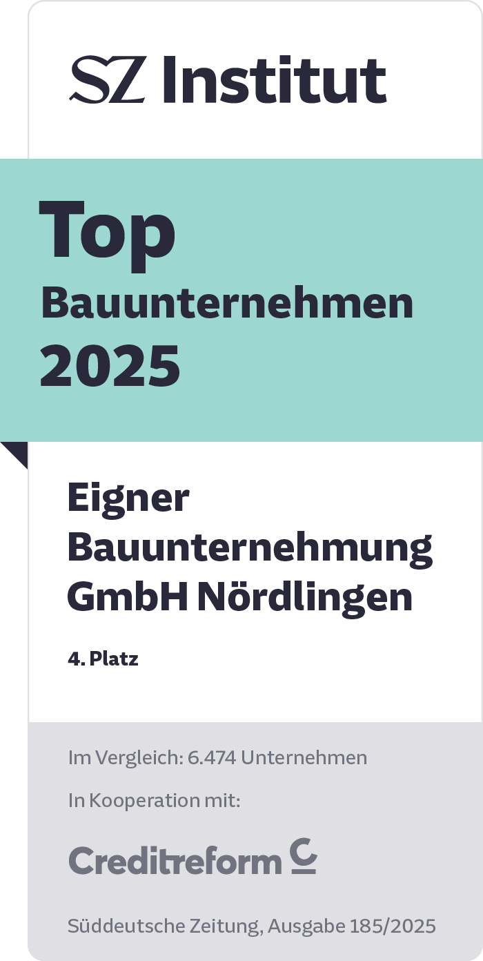 In der Süddeutschen Zeitung sind wir im bundesweiten Ranking der „Top Bauunternehmen 2025“ auf dem 4 Platz. Damit gehören wir offiziell zu den stärksten und erfolgreichsten Bauunternehmen Deutschlands – ein Ergebnis, das uns mit großem Stolz erfüllt. Besonders beeindruckend: Wir konnten uns in diesem Ranking gegen 6.474 Mitbewerber behaupten, die unterschiedlichste Größen, Strukturen und Spezialisierungen aufweisen.